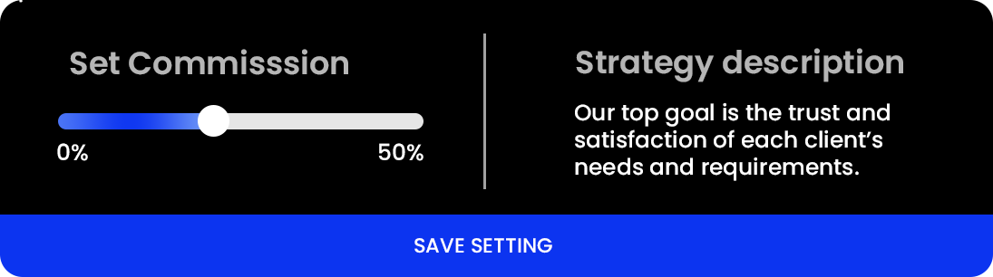 Go to your Master Area, view Settings, adjust the commission using the slider, and save changes. The new commission will only be applied to the Copiers who subscribed to you after the adjustment. For all other Copiers, the commission amount will remain unchanged.